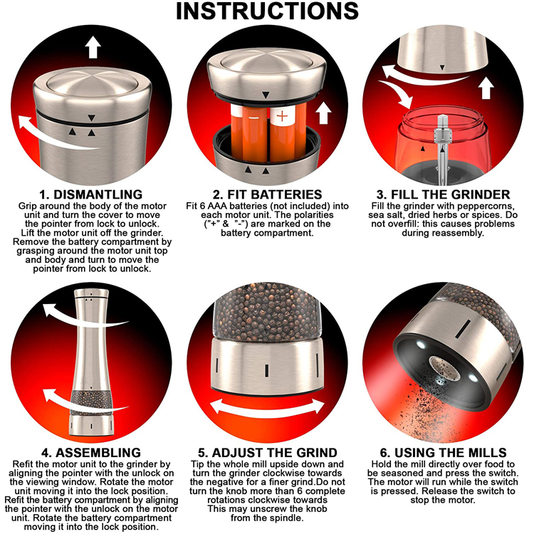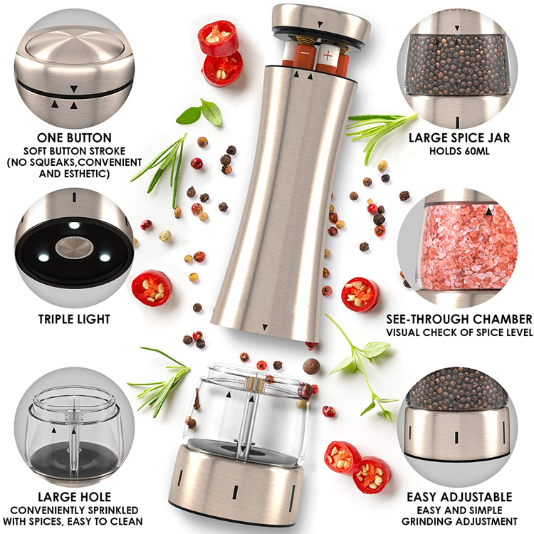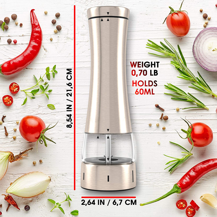 | DESCRIPCIÓN: | Molinillo de pimienta eléctrico (acero inoxidable) con triple luz LED |
